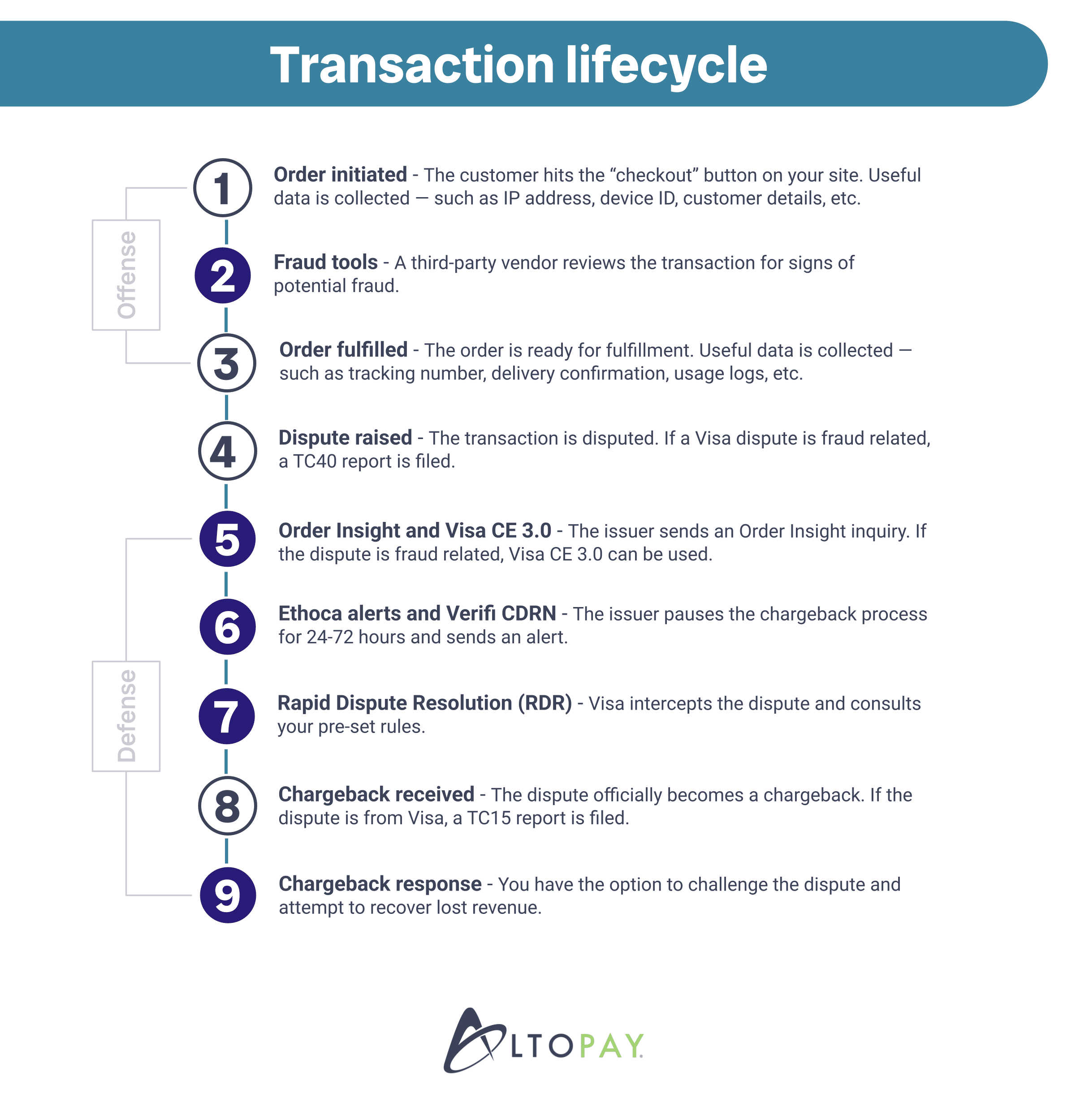 Chargeback management solutions can be inserted at various places in the nine-step transaction lifecycle.